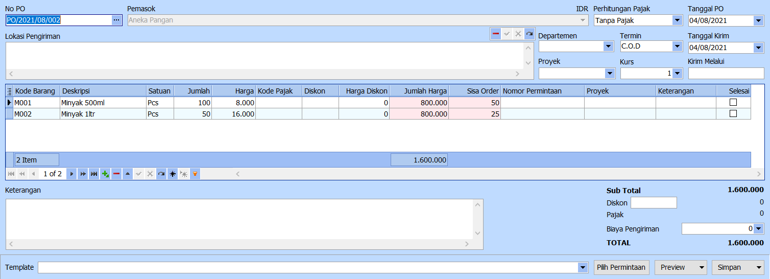 - Keterangan, berisi mengenai informasi singkat mengenai order pembelian ini, dan juga dapat berfungsi sebagai catatan kepada pemasok. Keterangan yang berada di bagian ini akan tampil di daftar order pembelian