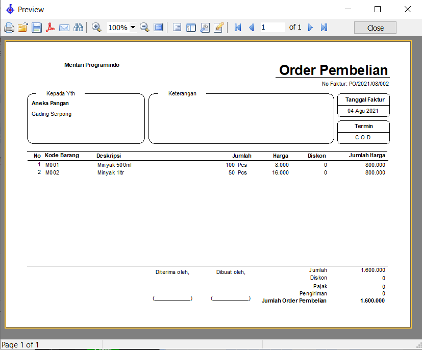 Jika pengisian sudah selesai, pengguna dapat mencetak order pembelian ini. Untuk mencetak, pengguna harus memilih desain template order pembelian. Klik di pilihan template di bagian bawah, lalu tekan tombol preview, dan pilih preview untuk melihat hasil cetakan di layar, atau pilih cetak untuk langsung mencetak ke printer.